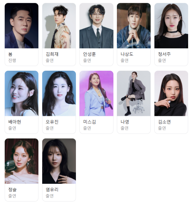 무대를 더욱 빛내줄 트로트 스타들이 총출동합니다! 김희재, 안성훈, 박지현을 비롯해 미스트롯 시즌3 TOP7인 정서주, 배아현, 오유진, 미스김, 나영, 김소연, 정슬, 염유리, 조정민 등 화려한 라인업이 매주 돌아가며 출연합니다. 이들의 공연은 단순한 무대를 넘어서, 감정과 이야기, 그리고 음악의 진심을 담은 무대가 될 것입니다. 특히, 라이브 밴드와 함께 펼쳐지는 퍼포먼스는 기존 트로트 방송과 차별화된 매력을 보여줄 예정입니다.